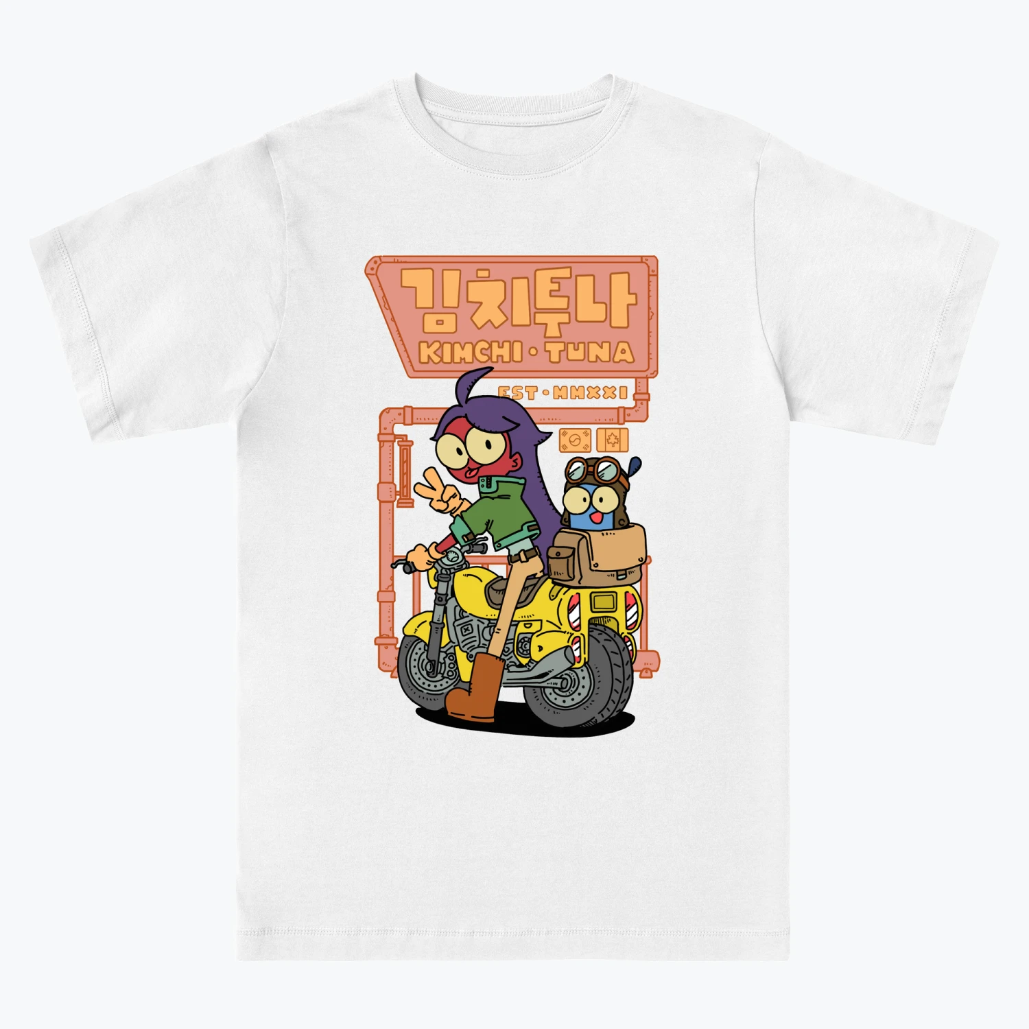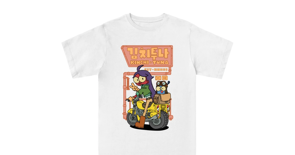 For our first shirt design we went with our main character, Kimchi, in a cool pose on a bike with Mini-Tuna peeking out of the saddle bag.The ESSENTIAL CLASSIC T-shirt is the most popular style we have on Everpress. Available in a regular fit, this tee features high-quality construction details, making it a standout design. This T-shirt is OEKO-TEX® certified and 170 gsm.
