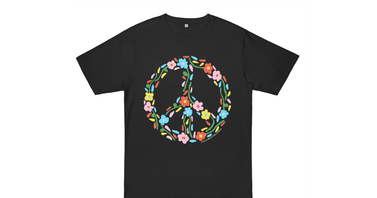 Pop coloured flowers all blooming together to bring a little peace into the worldCut to an Oversized fit, the EP19 is made from heavyweight 100% combed organic cotton and is Fair-Wear, Vegan and GOTS accredited. It’s production is 90% Reduced CO2 achieved by better manufacturing.