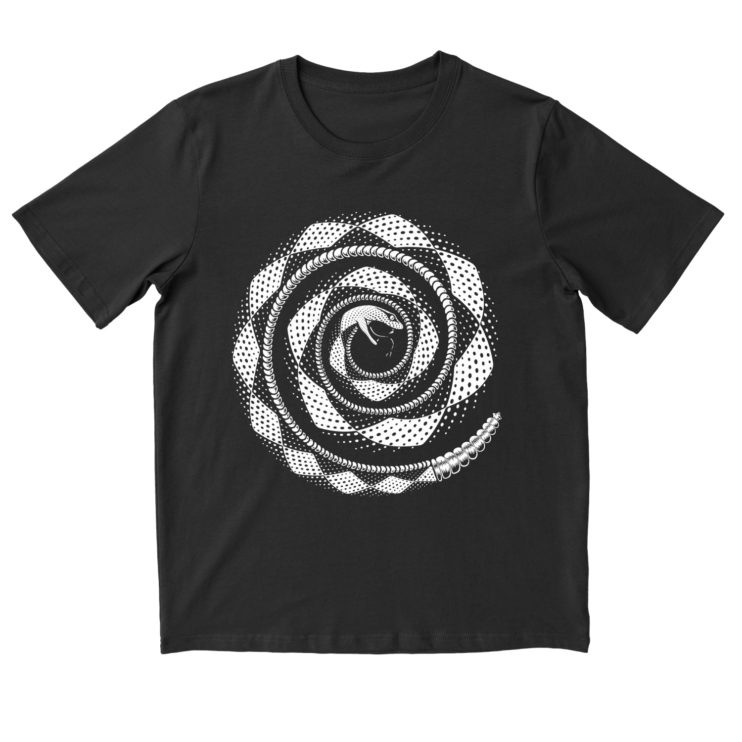 ULTRAMEGA Snake spiral print in white on a premium relaxed fit black T-shirt.Available in a regular fit, our PREMIUM RELAXED T-shirt is made from 100% heavyweight organic cotton. Like most of our styles, this T-shirt is Fair Wear, OEKO-TEX®, Vegan, GOTS approved and 220 gsm.